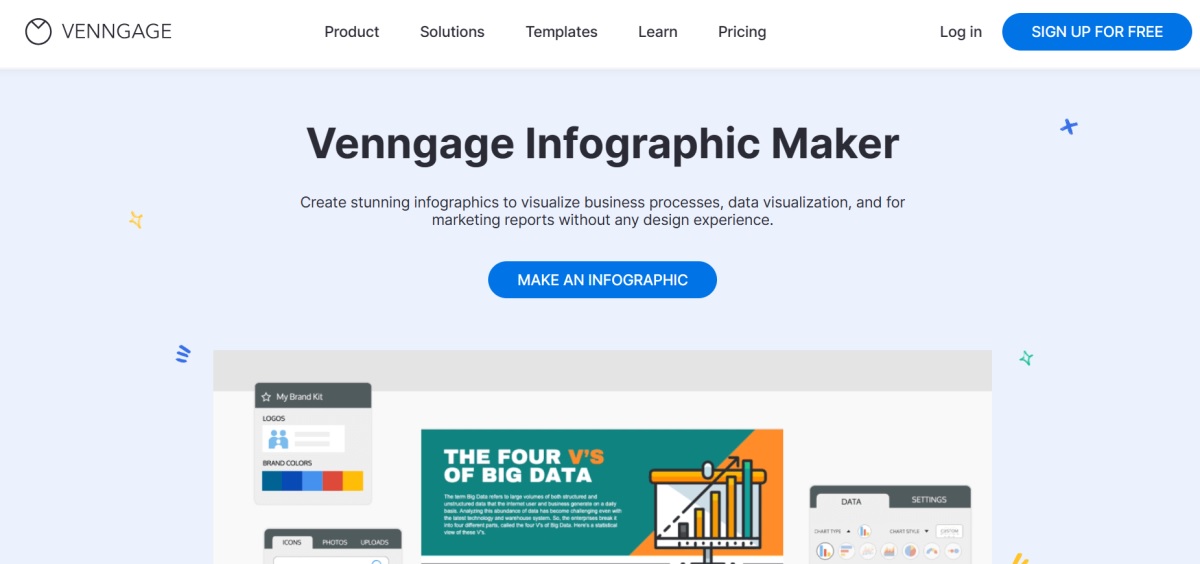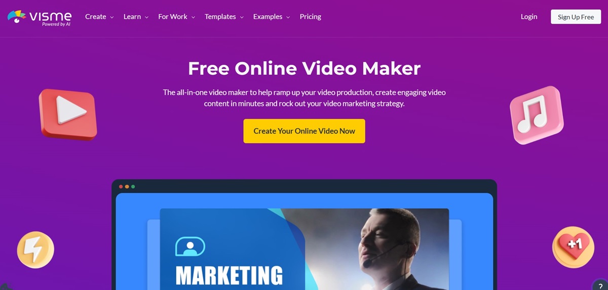 This platform streamlines video production with easy-to-use editing tools, pre-made templates, and stock media libraries. You can use Visme to create explainer videos, social media promos, presentations, and more, all within a user-friendly interface.