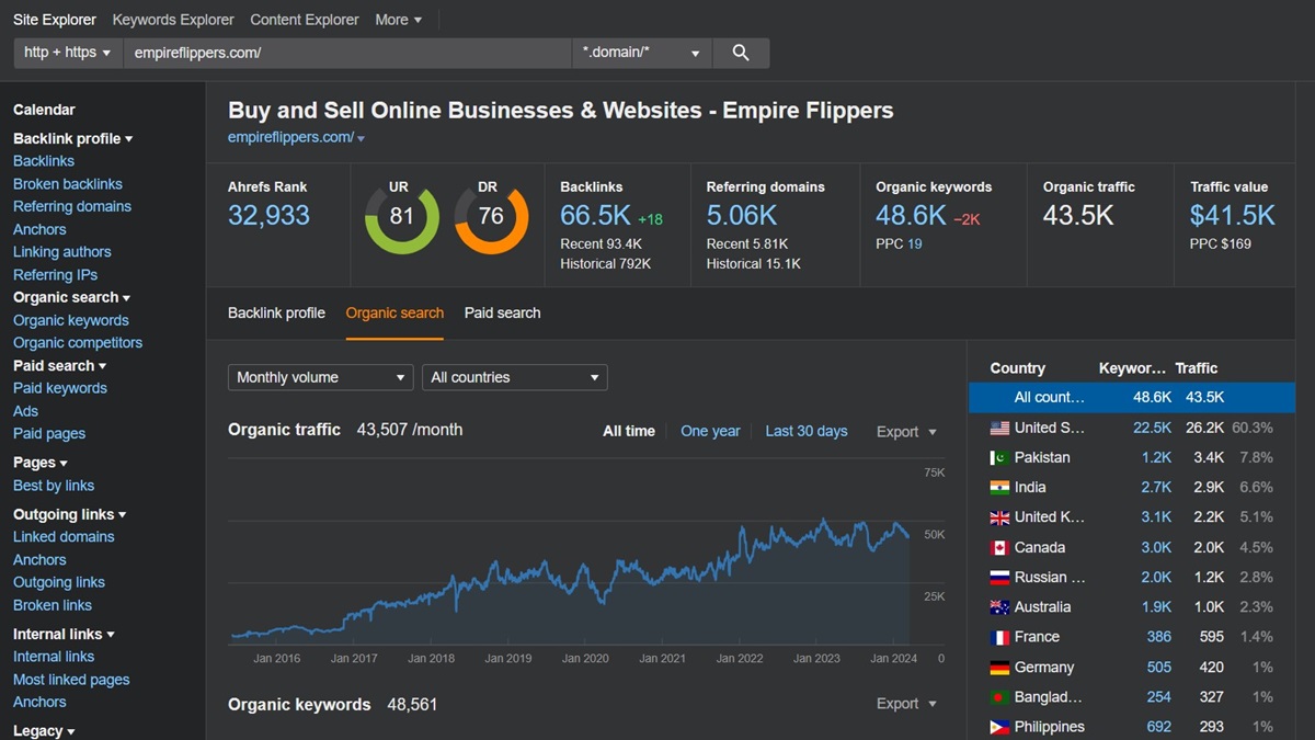 Ahrefs is a powerful tool that combines SEO with competitive intelligence. It provides in-depth insights into what’s working for your competitors, including their top-performing topics, backlinks, and organic keywords.