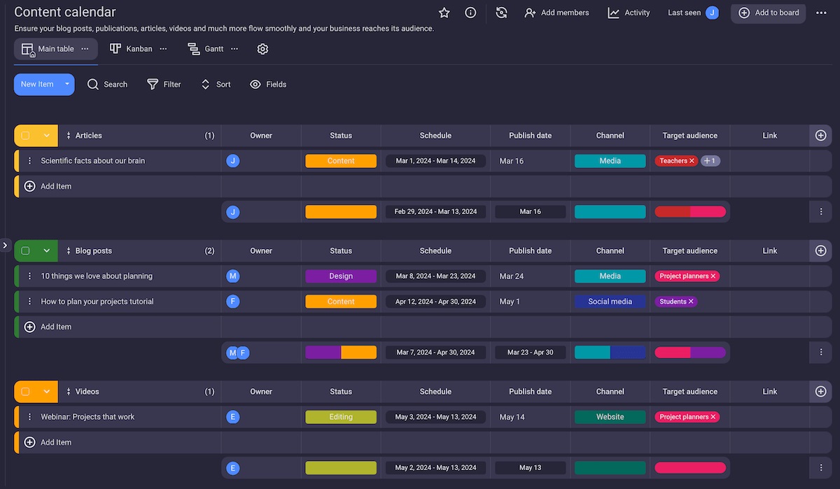 It offers a ready-made content calendar template that can spare you the trouble of creating your content calendar from scratch. You can also add further content details within Plaky’s fields, such as:
