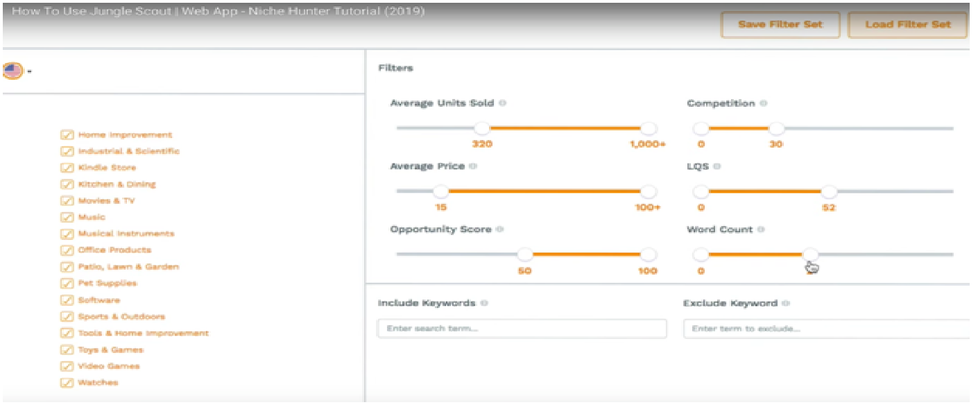 - Select the appropriate filters to ensure that only product categories with high Opportunity Scores are shown. You can choose the range of Opportunity Scores you’d like to see, and you can also filter your results based on sales volume, competition, listing quality, price, and more.