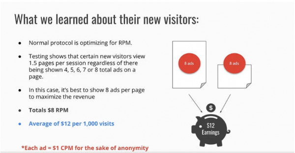 The first image gives an example of a website that used analytics to determine that most users who are visiting the website for the first time view 1.5 pages regardless of how many ads they are shown. With this information, we know that if the number of ads does not make a difference to the session duration of new users, they should show a higher number of ads to maximize revenue. What analytics also tells us, is that returning visitors will not behave the same to being shown a higher number of ads on a page as new visitors did.