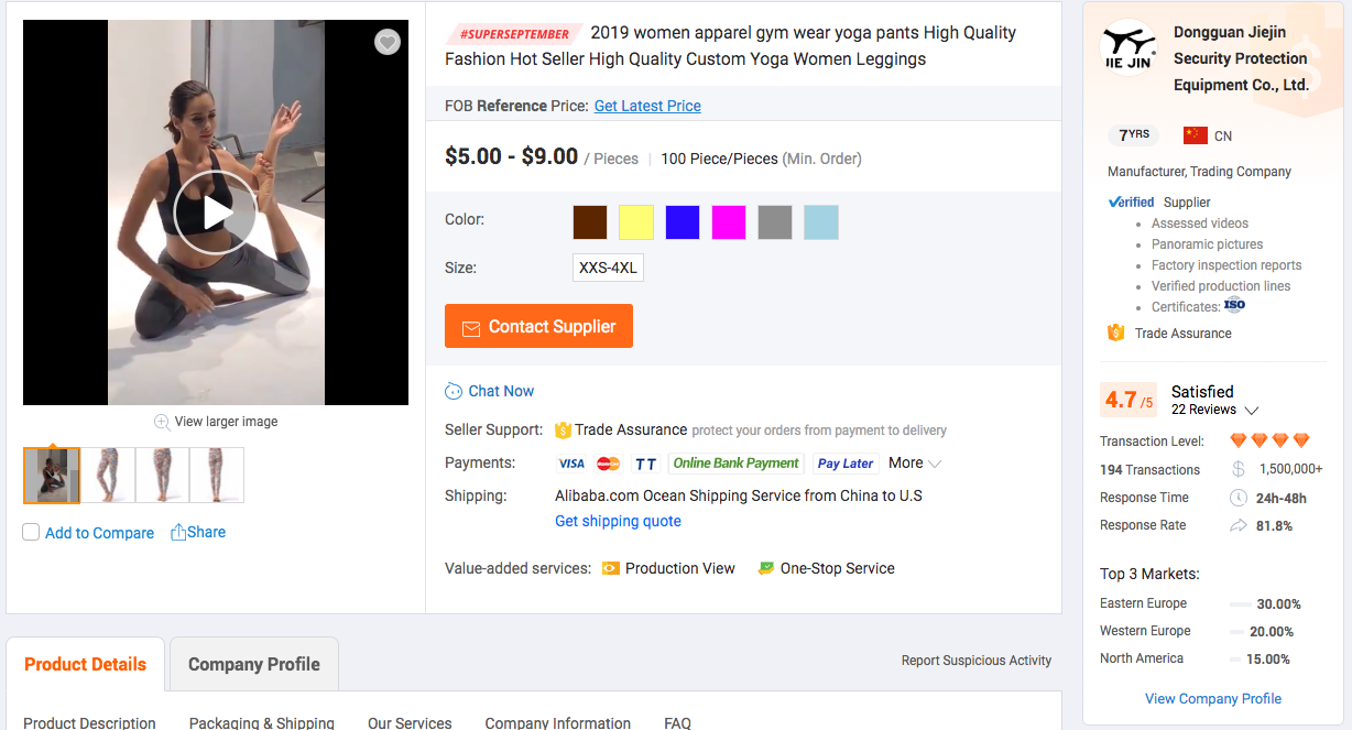 Once you click on a listing, you’ll be able to see the manufacturer’s profile, including how many transactions they’ve completed, how satisfied their customers are, which markets they serve, how much money they’ve made, and which product options you can customize.