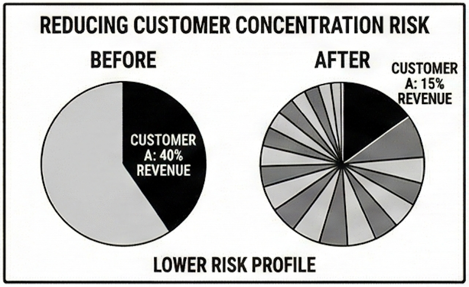Customer concentration is a major risk factor for buyers. If 30% of your revenue comes from one customer, that’s a red flag.