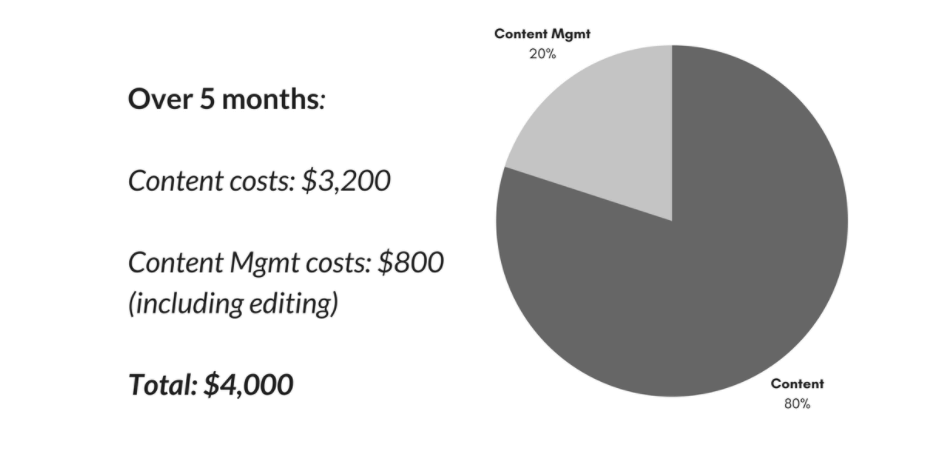The content costs were around $4,000, including the content, editing, and formatting within WordPress. The content was the bulk of the cost, about $3,200, and the editing and formatting covered the remainder. On average, each piece of content was 800 words long.