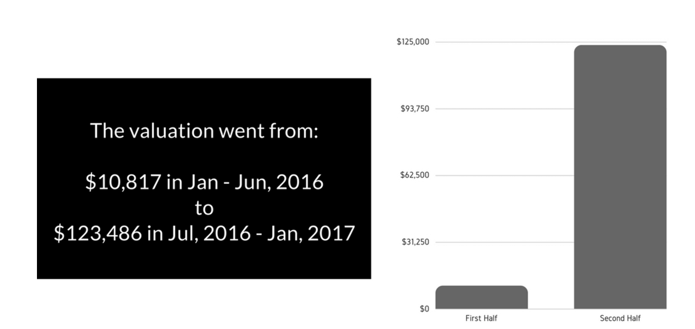 Consider the total valuation from January to June 2016 compared to September 2016 to January 2017. I used a conservative six-month average for the valuation and assumed a 25x monthly multiple.