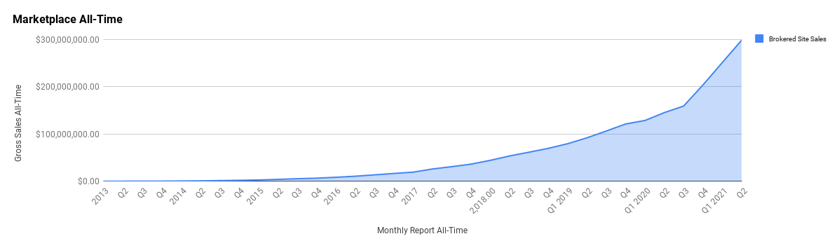 In Q3 2021, we sold $36,201,468.22 in brokeed businesses on our marketplace. This is down a fair amount from Q2 where we had $47,154,576.70 in sales. While that feels like a steep drop, this is still a huge number.