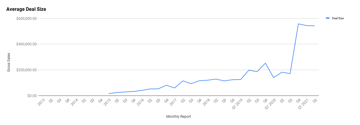 Overall, our average deal size remains incredibly high, and there’s no reason to think we can’t go even higher. As you can see in the graph below, we’ve reached a bit of a plateau when it comes to average deal size.