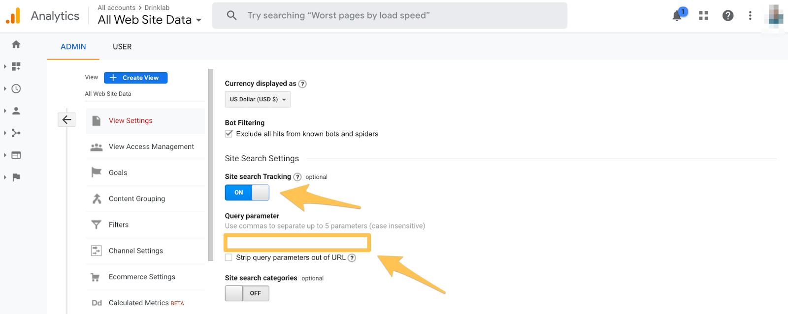 With the resulting URL, head to your Google Analytics account (Admin > Create View > View Settings). Then, scroll down until you see “Site Search Tracking.”