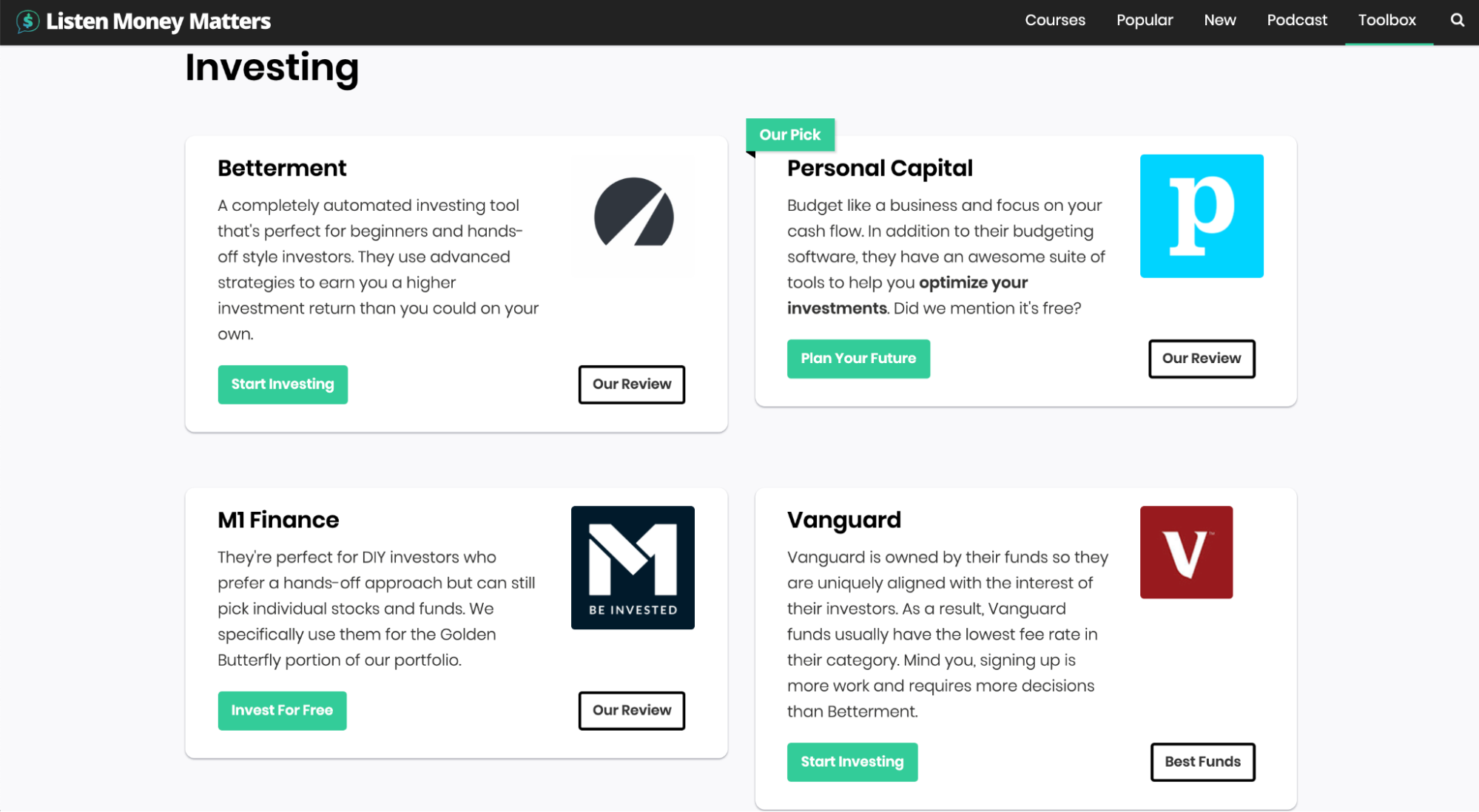 Our personal finance site has a Toolbox with the following affiliate link categories appearing on a single page: