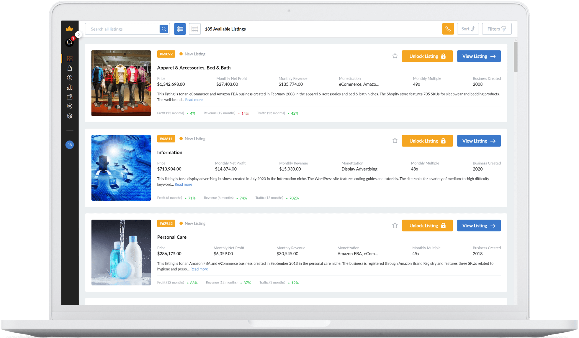 See an online business or website you like? Unlock the listing for access to everything you need to review your potential purchase: URL, Google Analytics, Profit & Loss Statement, etc.