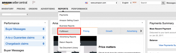 - In the Seller Central home page, go to Reports tab, click Fulfillment.
