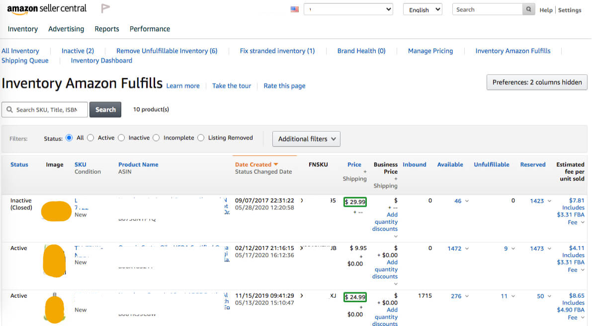 On this next page, you will see all the products currently within your account catalog. This will include detailed item information, such as SKUs, listing page creation dates, current prices per unit, and current listing statuses which you can see below.