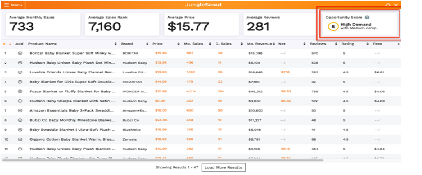 - You’ll see an Opportunity Score along with other valuable data, including average monthly sales, sales rank, price, number of reviews, whether the item is fulfilled by Amazon or the merchant, and more.