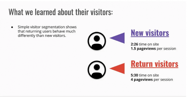 Pictured below is a great example of visitor segmentation; grouping new visitors and returning visitors. The image shown below shows us that through visitor segmentation, we can look at new and returning visitors and evaluate how metrics such as time spent on site and pageviews per session differentiate between the groups.