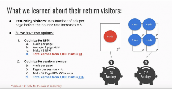 If your website analytics tell you that returning users visit three more pages per visit than a new visitor, you need to optimize the session revenue for returning users by showing them less ads for a higher EPMV (earnings per thousand visitors) on each page. Since we know that returning users will likely be visiting more pages, we need to spread out the number of ads these visitors see.
