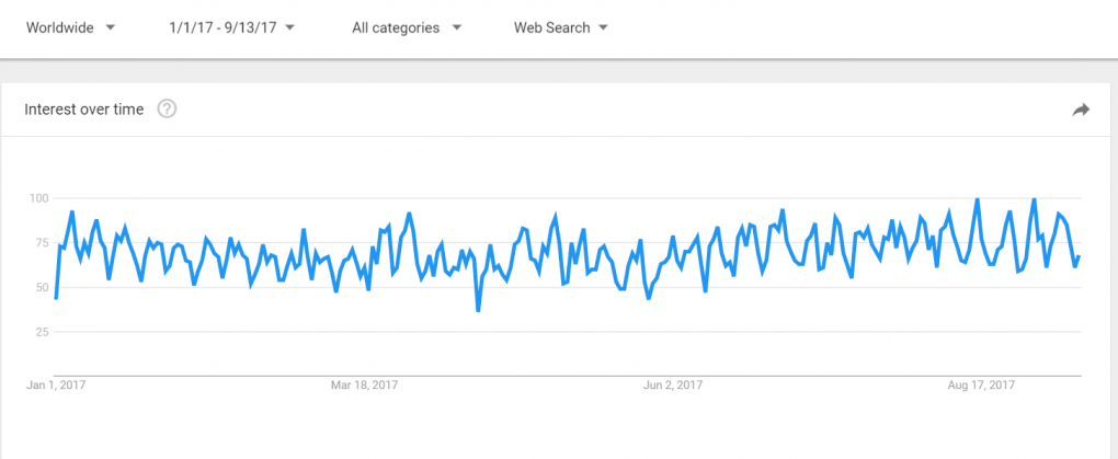 For this research, we analyzed the sales of 19 Amazon FBA businesses for sale from January through September 2017. Before we get into the deal specifics, let’s first look take a look at the current popularity of Amazon FBA using good old Google Trends:
