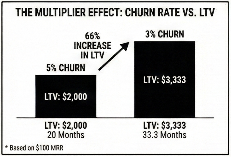 If you can reduce monthly churn from 5% to 3% over 90 days, you’re fundamentally changing the risk profile and, by extension, the valuation.