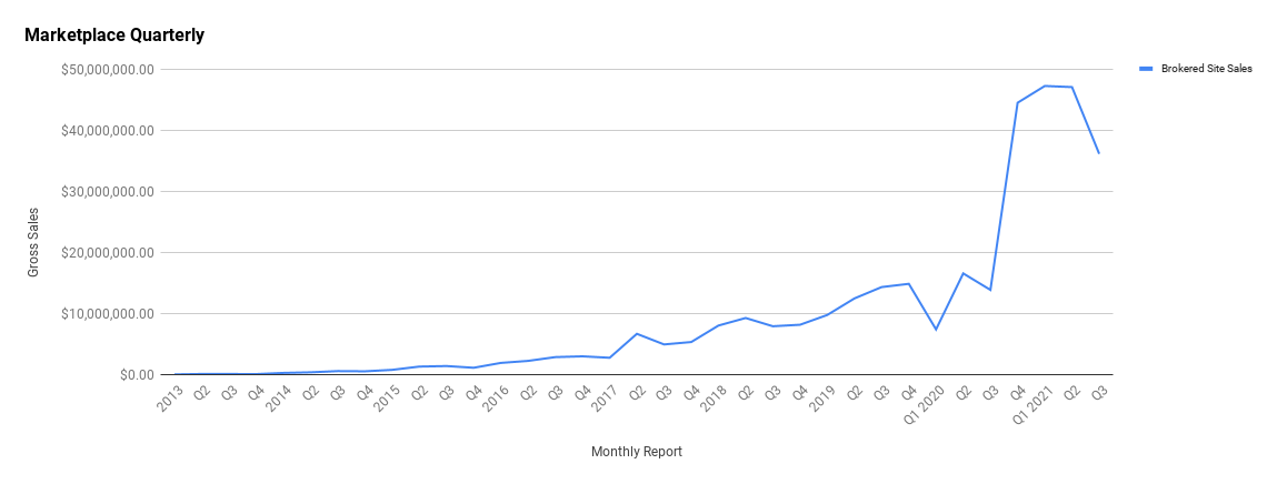 In Q3 2021, we sold $36,201,468.22 in brokeed businesses on our marketplace. This is down a fair amount from Q2 where we had $47,154,576.70 in sales. While that feels like a steep drop, this is still a huge number.