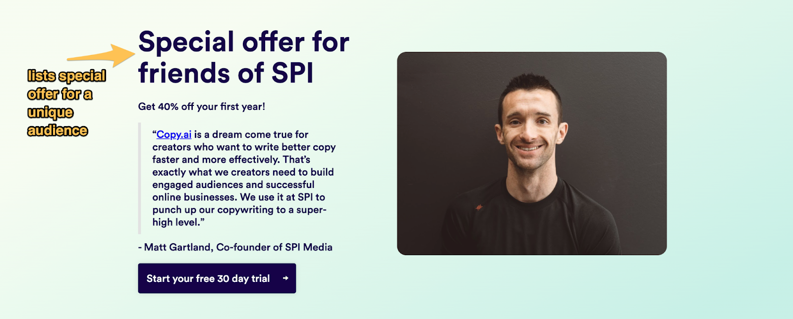 Take a look at how Copy.ai created a unique page for Pat Flynn’s SPI readers. Unique pages like this have helped our sites improve conversions.