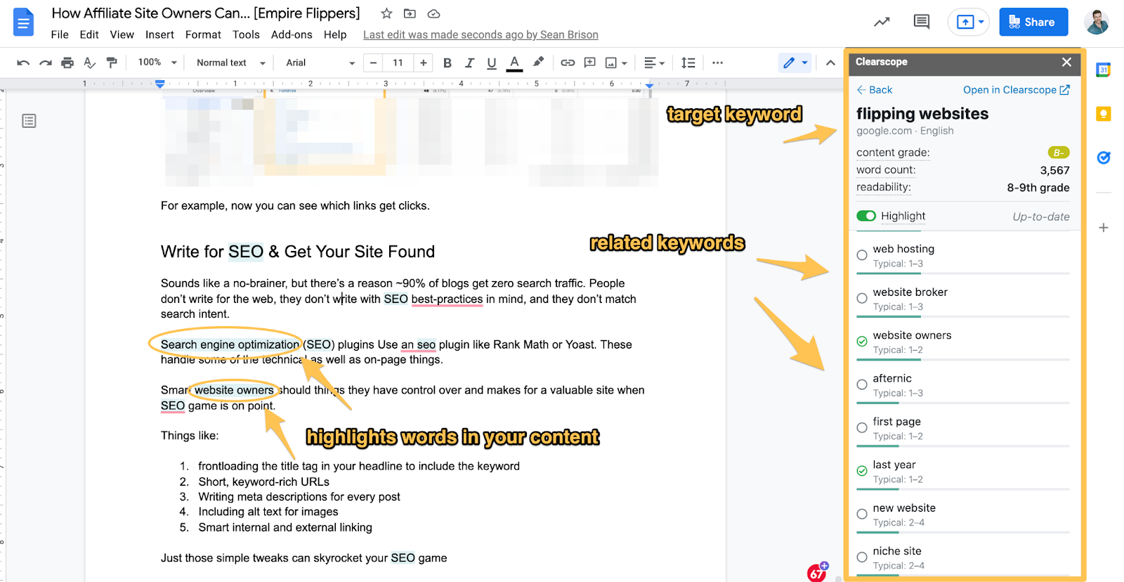 Clearscope optimizes your post with keywords relevant to your seed keyword, making sure you cover as much ground as you can. If you’re running a content site, a tool like this is invaluable.