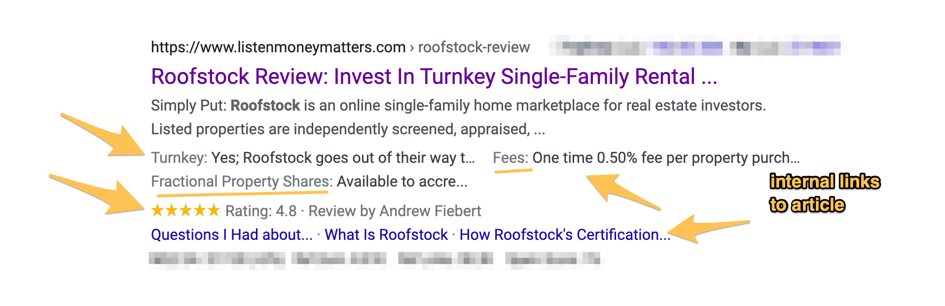 In the case shown above, a review of Roofstock, a real estate–product, Google included enriched results, such as the following: