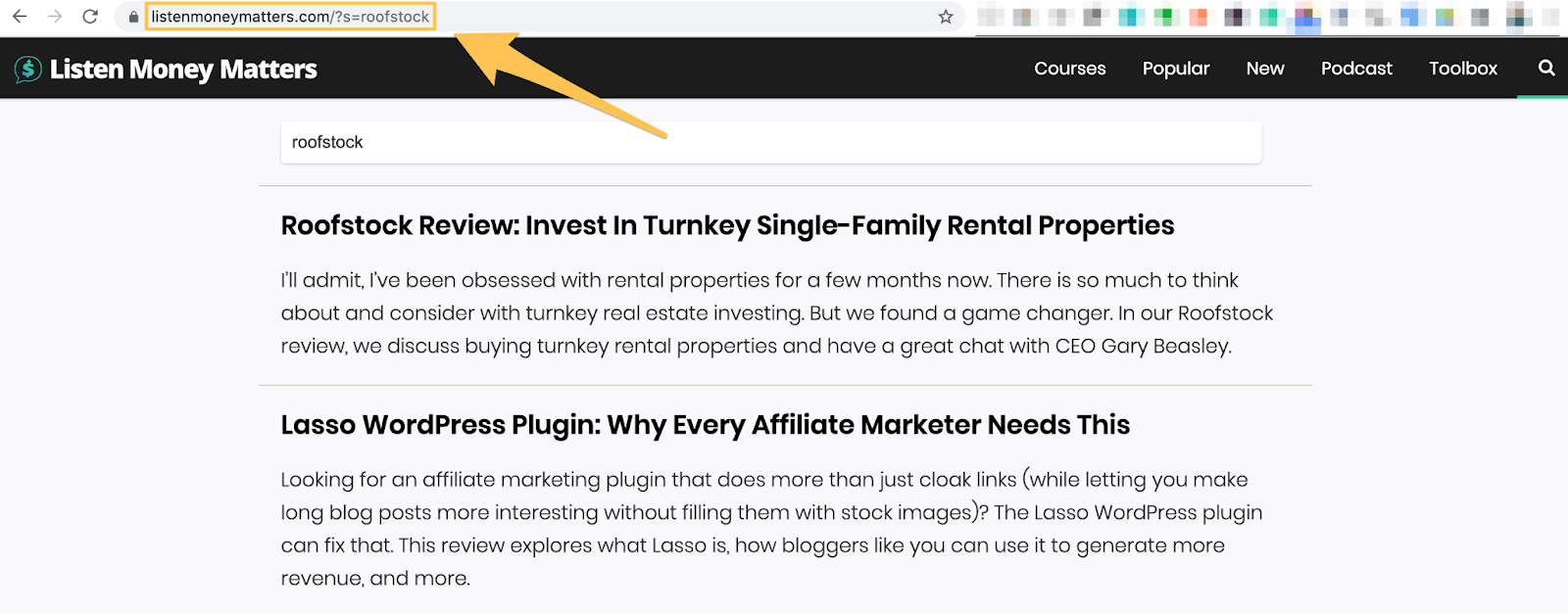 To set up site search tracking, perform a search on your website. For example, I’ll use the search term “roofstock” on our finance site.