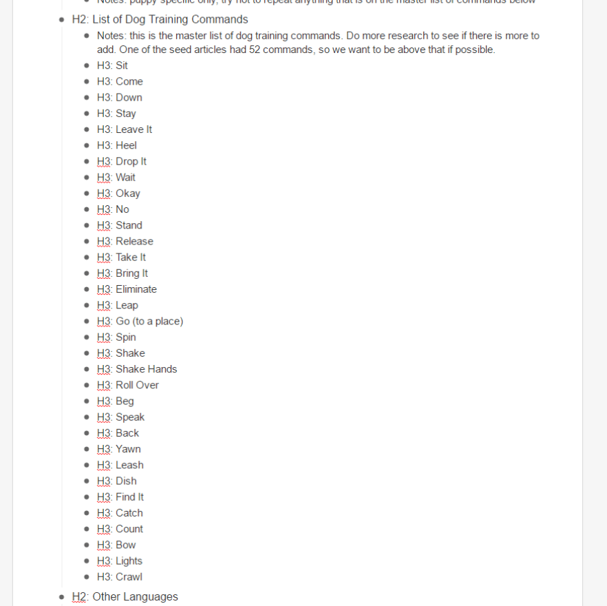 Keep in mind that, up to this point, I have not done any significant research on the topic of dog training commands. Yet I was able to create a professional looking article outline that rivals anything online right now.